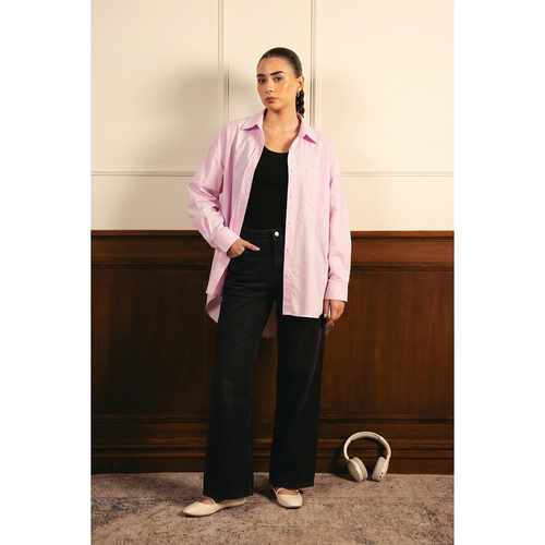 Baby Pink Button Down Shirt with Black Inner & Black Wide Legs Jeans