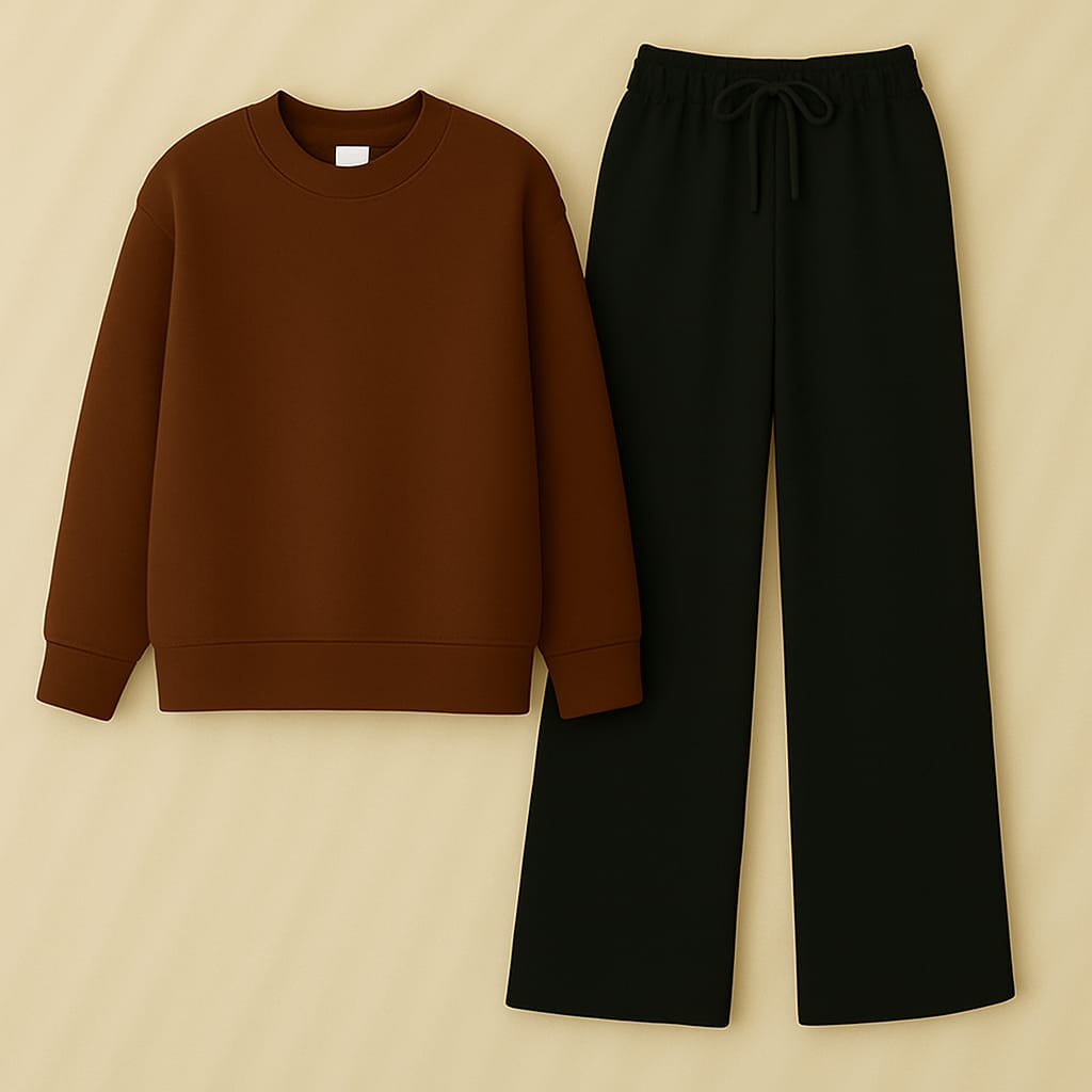Sweatshirt with black flapper is a sleek and comfortable outfit made for everyday ease. The sweatshirt is tailored from soft fleece cotton, giving a warm and cozy feel. It pairs with black flapper trousers in the same fleece cotton fabric, creating a coordinated and relaxed look. Ideal for casual wear, lounging, or stepping out in effortless style.