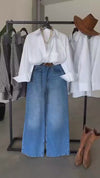 combo of a classic button down shirt paired with wide leg jeans. Designed for comfort and fashion, this outfit is versatile enough for casual outings, work, or a day out with friends.