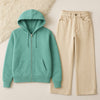 Zipper hoodie with beige wide leg jeans creates a casual yet stylish look. The zipper hoodie, made from soft fleece cotton, offers comfort and warmth with a relaxed fit. Paired with beige wide leg jeans crafted from durable denim fabric, this outfit balances coziness with a modern, laid-back vibe. Perfect for everyday wear, it combines ease and versatility effortlessly.