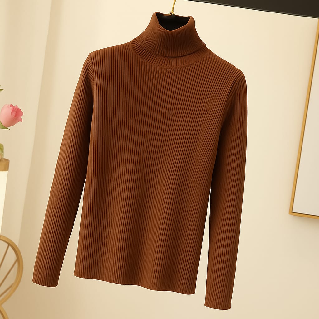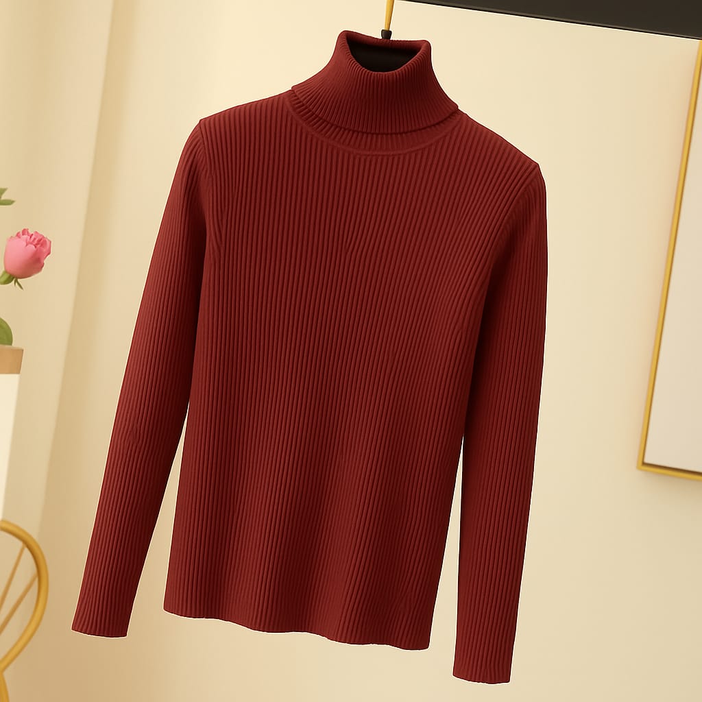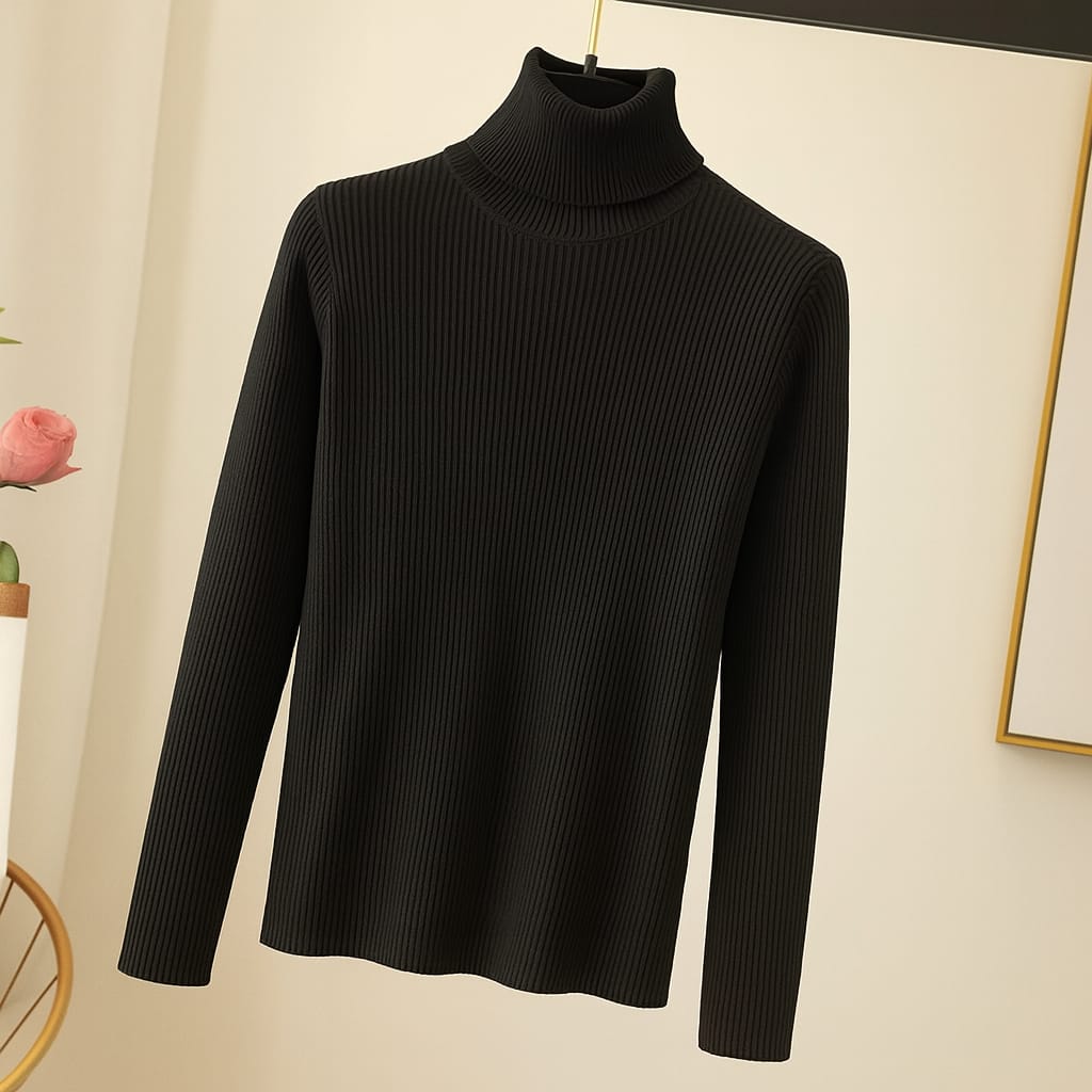 This highneck is crafted from soft rib knit fabric, offering a comfortable and flexible fit. The ribbed texture adds a classic, structured look while providing warmth and coziness. Perfect for layering or wearing on its own, it combines style with comfort for everyday wear.