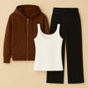 Zipper Hoodie With Inner & Black Wide Leg Jeans is a stylish and comfortable outfit choice. The zipper hoodie is made from soft fleece cotton, providing warmth and ease for daily wear. It is paired with a rib knit inner, adding a layer of texture and comfort. Completing the look, the black wide leg jeans are crafted from durable denim fabric, offering a relaxed yet trendy silhouette. This outfit balances casual style with modern appeal, perfect for everyday wear.