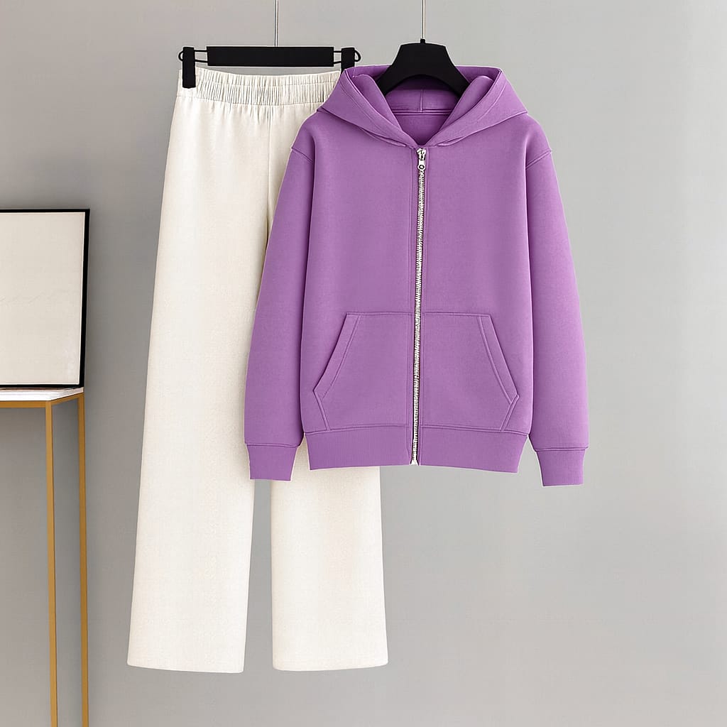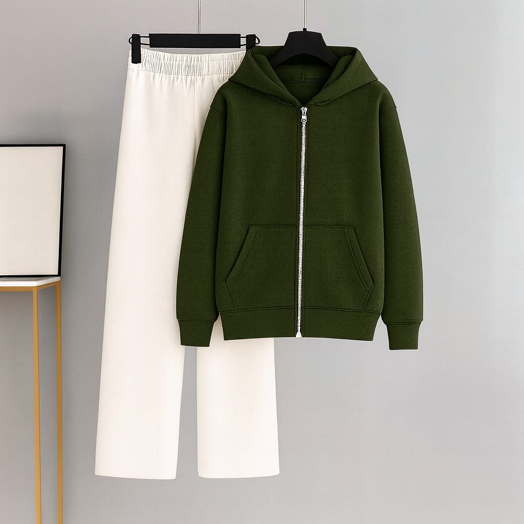 vThis cozy and stylish outfit pairs a soft zipper hoodie with beige flapper trousers for a relaxed yet trendy look. The hoodie is crafted from fleece cotton, providing warmth and comfort, perfect for casual wear. It features a smooth zipper closure and a clean silhouette. The flapper trouser is made from terry fabric, offering a soft texture and a flattering wide-leg fit that adds a touch of effortless elegance. Ideal for everyday wear, lounging, or casual outings.