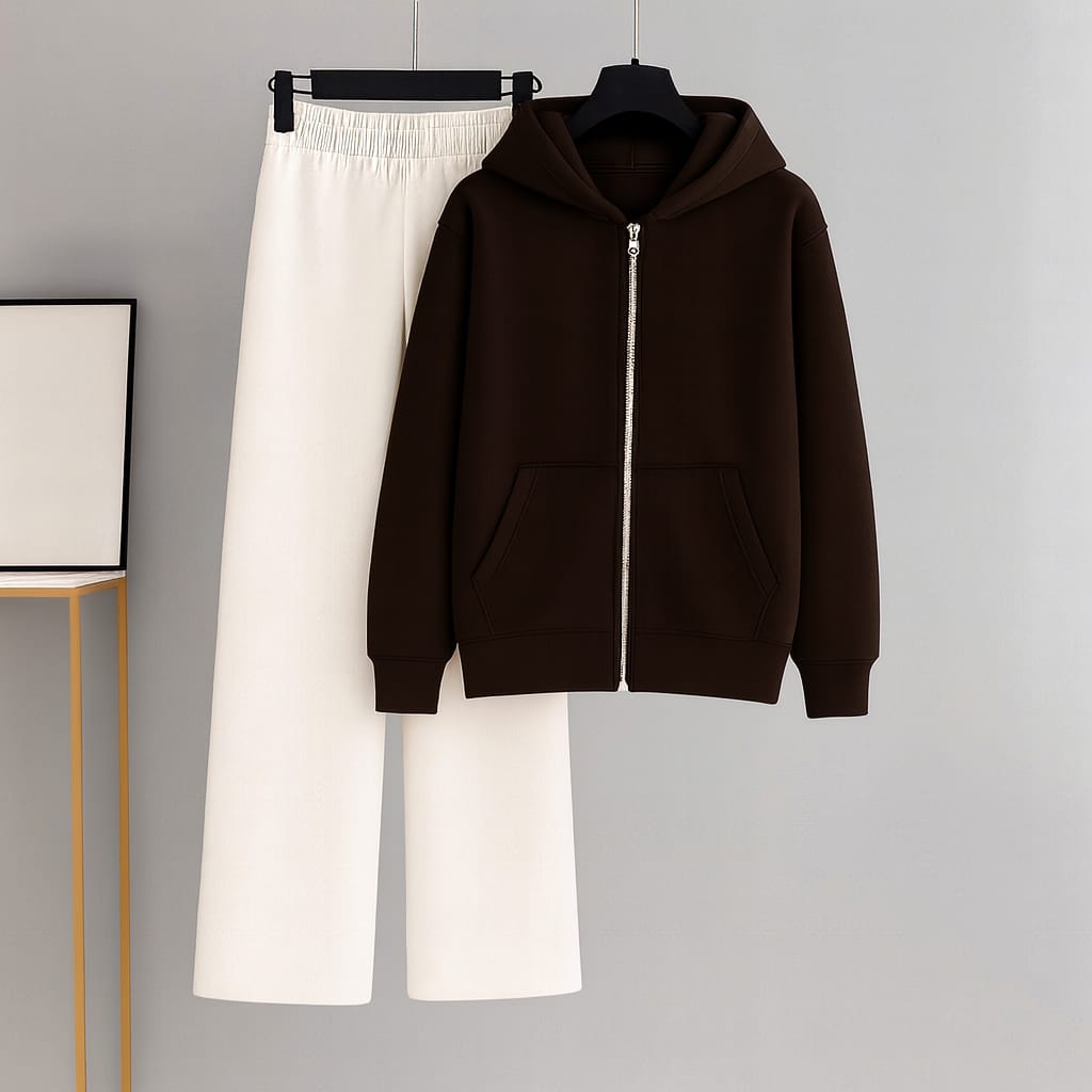 vThis cozy and stylish outfit pairs a soft zipper hoodie with beige flapper trousers for a relaxed yet trendy look. The hoodie is crafted from fleece cotton, providing warmth and comfort, perfect for casual wear. It features a smooth zipper closure and a clean silhouette. The flapper trouser is made from terry fabric, offering a soft texture and a flattering wide-leg fit that adds a touch of effortless elegance. Ideal for everyday wear, lounging, or casual outings.